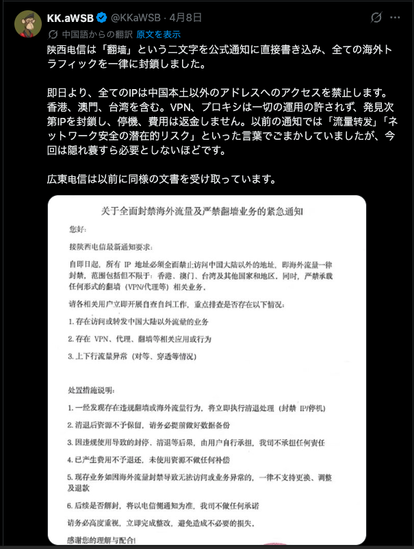 また、あるユーザー様は中国電信に「VPNが使えない」とクレームをつけられました。来訪したエンジニアは「回線は正常なのにVPNアプリが使えない理由はわからない」と述べたとのことです。ですのでこの通達については社内でもまだ十分に共有されていないようです。